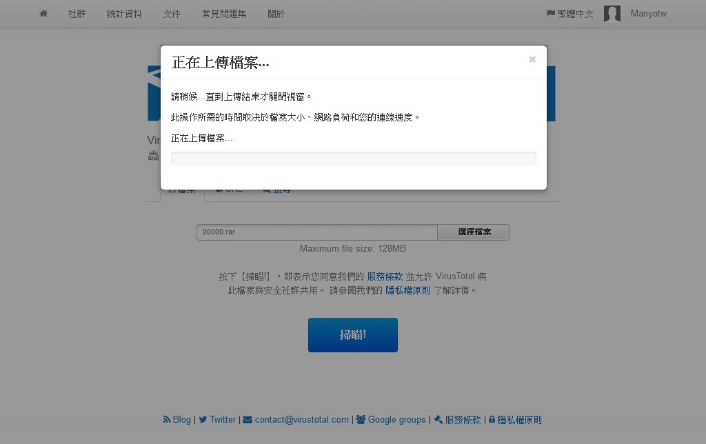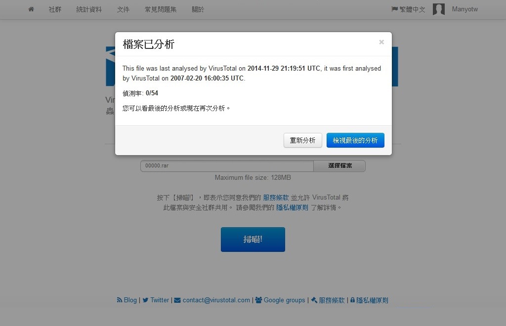 網址:https://www.virustotal.com/zh-tw/ 首先先選擇檔案。 會開啟一個上傳檔案的視窗,選擇好要上傳的檔案之後選擇開啟。 之後按下掃描。 出現掃描結果。(也可以按重新分析。)